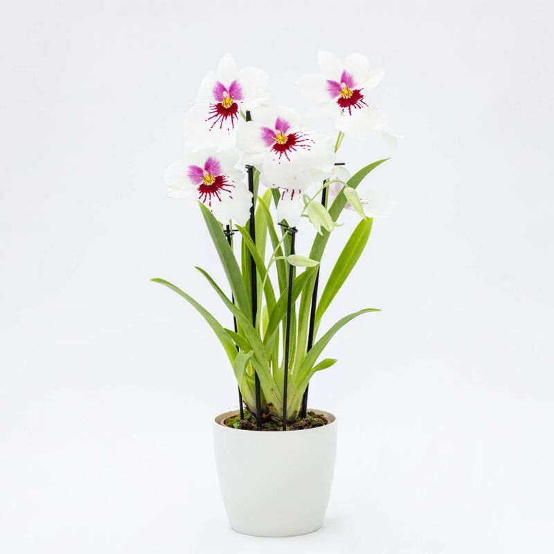 La pianta di Orchidea Miltonia "White Purple" è originaria del Brasile e produce grandi fiori profumati dai colori sgargianti, il fiore è simile a quello della Viola del pensiero. Predilige luoghi luminosi, ma non la luce diretta. Le annaffiature devono essere regolari una o due volte la settimana cercando di evitare il ristagno dell'acqua all'interno dell'eventuale coprivaso, che potrebbe dare origine a malattie fungine dannose per la pianta. Vaporizzarla spesso con acqua distillata. Le concimazioni devono essere regolari da Marzo ad Ottobre. ATTENZIONE: il periodo di fioritura è indicativo dell'intervallo in cui mediamente compaiono i fiori. NON significa che sia necessariamente provvista di fiori in quei mesi all'atto dell'acquisto. In ogni caso tutte le orchidee vendute sono IN FORZA FIORE, vale a dire che sono piante adulte, che hanno già fiorito e che rifioriranno.© Foto Vivai le Georgiche soc. agr. - riproduzione vietata