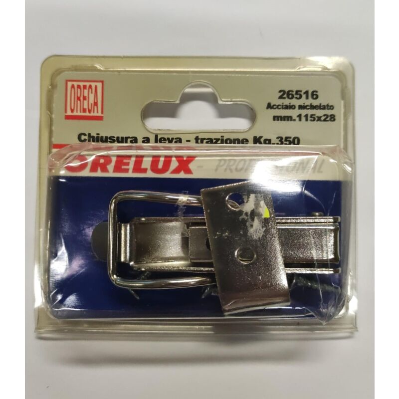 ORECA - CHIUSURA A LEVA 115X28MM Trazione max 350kg. In acciaio nichelato. Elementi di montaggio inclusi.