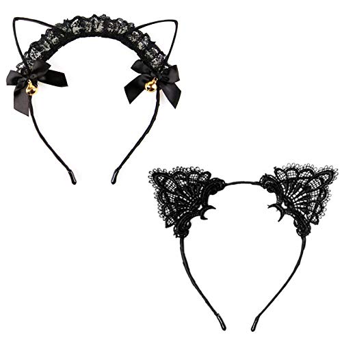 2pcs Orecchie gatto fascia, serra testa orecchio di gatto in pizzo, graziosi cerchi in metallo bella fascia per capelli, nero cerchietto in pizzo per la vostra mascherata festa di compleanno Natale