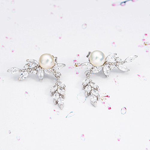 Orecchini Argento 925,EVER FAITH zirconia 4MM Perla coltivata d'acqua dolce Affascinante Foglia Orecchini cuff e wrap Orecchini Lobo