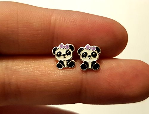 Orecchini in argento sterling a forma di orsetto panda con fiocco viola