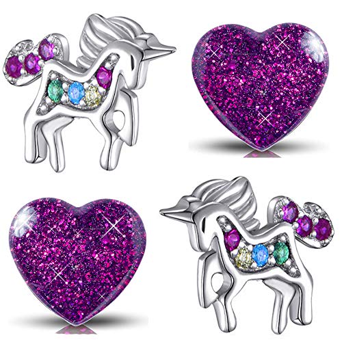 2 paia di orecchini a forma di unicorno, in vero argento Sterling 925, con zirconi e cristalli di zirconia, + 1 paio di orecchini a forma di cuore in acciaio inox con glitter