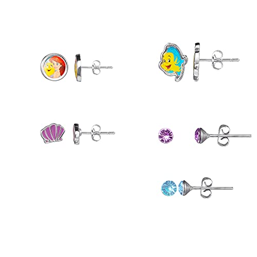 Set di 6 paia di orecchini raffiguranti i personaggi del film de LaSirenetta. Realizzati in ottone e colorati con lo smalto. Impreziositi da zirconia di colore azzurro.