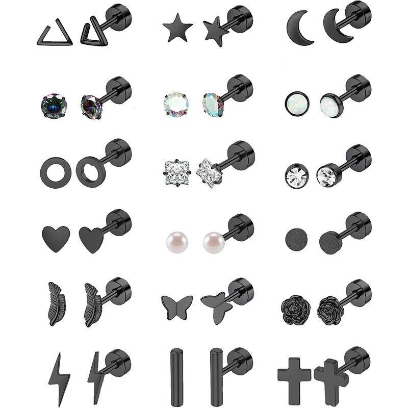 Set di 18 paia di orecchini - Puoi ottenere 18 paia di orecchini in acciaio inossidabile con un ordine. Ci sono orecchini con cartilagine arcobaleno di zirconi cubici, opale, triangolo, luna, stella, farfalla, fiore, foglia Vite geometrica- su orecchini, ecc. Questi orecchini con la parte posteriore piatta possono essere usati come una festa di lavoro e un gioco per soddisfare le donne. Il set di orecchini minuscoli con la parte posteriore piatta più alla moda, vale la pena acquistare. Misura orecchini - -- Calibro: 20 G (0, 8 mm) Spessore del perno, lunghezza dello stelo: 6 mm, dimensioni della parte posteriore piatta: 5 mm, perla/opale/opaco/cuore/zirconia cubica: 4 mm;