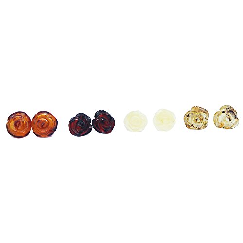 Orecchini a bottone in ambra baltica color miele, a forma di rosa, dotati di chiusura posteriore in argento sterling;