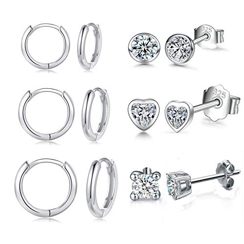 Set di orecchini a cerchio in argento e orecchini a cerchio, dimensioni: 3 paia di piccoli orecchini a cerchio, diametro interno: 8 mm/10 mm/12 mm. 3 paia di piccoli orecchini a perno con zirconia cubica di diametro 3 mm, con chiusura a farfalla in argento Sterling 925. Leggero e comodo da indossare, può essere come orecchini a letto. Puoi condividere questo set di 6 paia di orecchini a cerchio in argento con la tua famiglia e gli amici. Adatto per donne, uomini, ragazze, ragazzi e bambini.