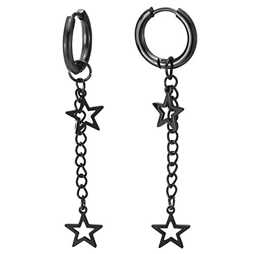 2 Nero Orecchini a Cerchio con Pendenti Lunga Catena e Due Aperto Stella, Orecchini da Uomo Donna, Acciaio Inossidabile