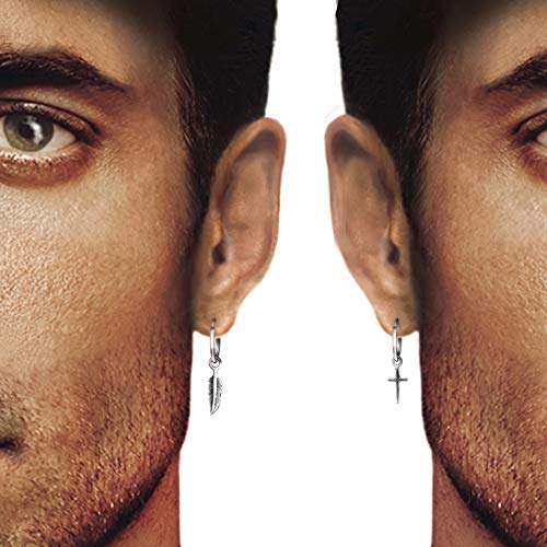 TJS Orecchini Cerchio con Pendenti Piuma e Croce, Argento 925, Senza Nichel, Anallergici, Intercambiabili, Diametro 14mm