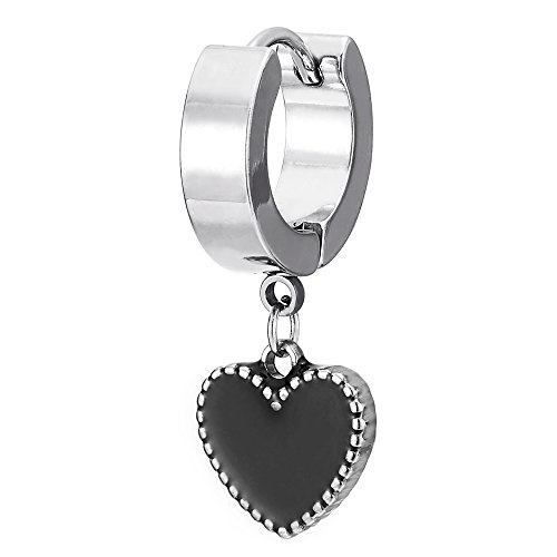 2 Orecchini a Cerchio con Nero Smalto Cuore, Orecchini da Donna, Acciaio Inossidabile
