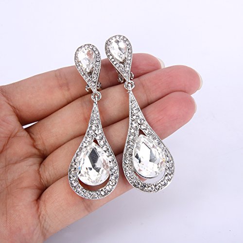Orecchini donna,EVER FAITH Austriaco Cristallo Doppio Lacrima goccia Clip-on Ciondola gli Orecchini Trasparente Argento-fondo