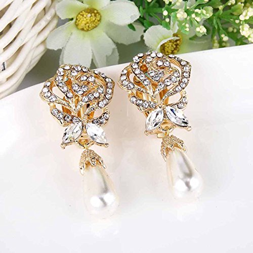 Orecchini donna,EVER FAITH Cristallo austriaco Perla simulata Sposa Rose Fiore Goccia Clip-on Orecchini Trasparente Oro-fondo