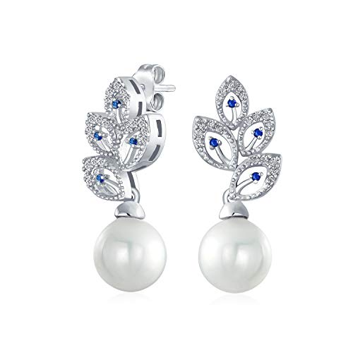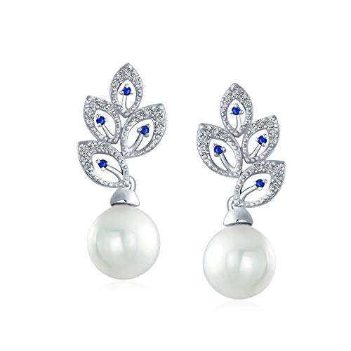 Sbalorditivi per una sposa o un bel qualcosa di blu, questi orecchini a goccia in ottone da sposa ti ispireranno a dire I DO. Con un design divino in stile vintage cz lascia il design con accenti di zaffiro simulati e una perla simulata luminosa da 10 mm sotto.