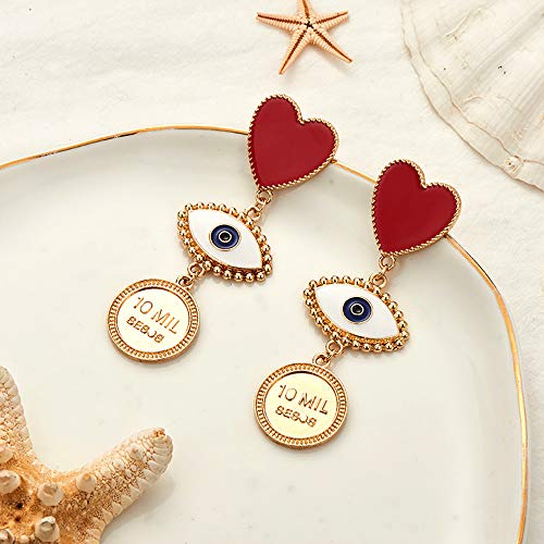 Materiale: gli orecchini cuore rosso sono realizzati in lega. Dimensione: The Heart Studs: 2.5CM / 1 "(L) x 2.7CM / 1.1" (W). Gli orecchini pendenti di Evil Eye: 7CM / 2.8 "(L) x 2CM / 0.8" (W).