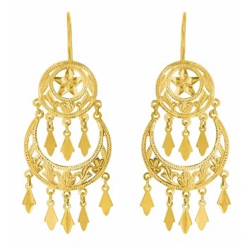 Orecchini in oro 18 kt Questi splendidi orecchini orientali pendenti a 1 piano filigranati con la forma di un cerchio con chiusura a monachella hanno un'altezza di 6,4 cm e una larghezza di 2,5 cm. Questi orecchini di un peso di 6,90 grammi vi saranno consegnati in un prezioso cofanetto di velluto.
