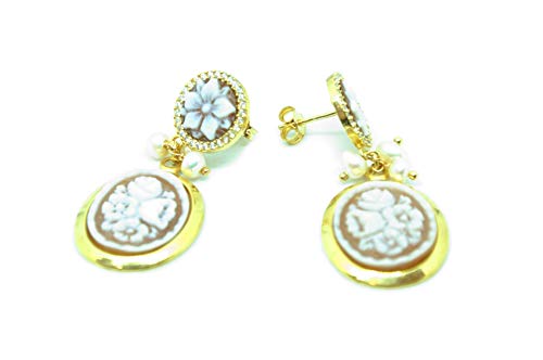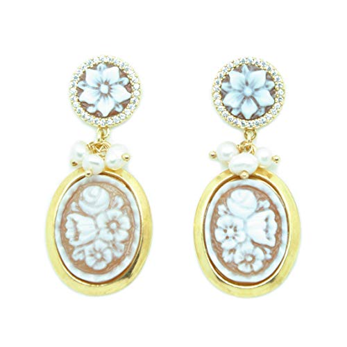 Orecchini di Perle Zirconi e Cammei in Argento 925 Placcato Oro Torre del Greco