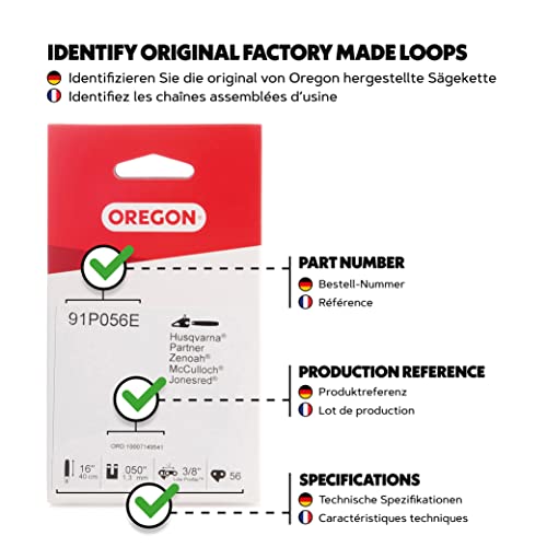 Dimensioni: per tutte le marche di motoseghe con passo da 3/8", calibro da 1,3 mm e 56 maglie di trasmissione. Compatibile con Oregon 91PJ056X, 91PJ056E, 91P056E, 91P056X, 91PX056X, 91PX056E