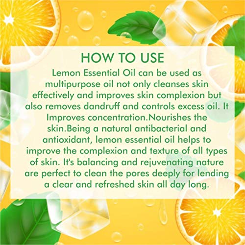 ASTRINGENT: Lemon Essential Oil is a holistic solution to skin problems due to its antiseptic and astringent properties. It helps in reducing excessive oil production from your skin. Allow yourself to get a calming and stimulating break from outside pollution, by diffusing few drops of lemon essential oil in any diffuser