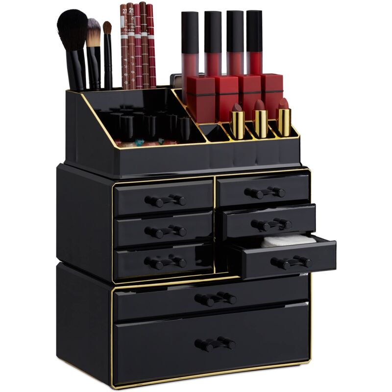 Con l'organizer per make-up potrete finalmente ordinare il vostro tavolino da trucco e dire basta all'estenuante ricerca di cosmetici in astucci e beauty case. Composto da tre box, il set offre con i suoi 24 scomparti tanto zio per sistemare trucchi e gioielli. I cassetti rivestiti in velluto, infatti, sono ideali sia per creme, cipria, ombretti ma anche orologi, collane e braccialetti. Il pratico contenitore per rossetti è adatto anche per riporre lipstick, pennelli, matite e tanto altro. Create il vostro kit personalizzato con questi box porta trucchi impilabili. Organizer make-up in dettaglio set in 3 pezzi misure hxlxp: 30 x 24 x 14 cm ca. Numero scomparti: 24 peso: 2,2 kg ca. Materiale: acrilico colore: bianco o trarentecontenitore per cosmetici con cassetti cassetto grande hxlxp: 6 x 21 x 12,5 cm ca. Cassetto piatto hxlxp: 3 x 21 x 12,5 cm ca. Cassetti piccoli hxlxp: 3 x 9,5 x 12,5 cm ca. Porta rossetti con 16 scomparti 1 scomparto grande hxlxp: 7,5 x 10 x 9 cm ca. 1 scomparto