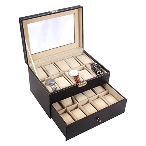 Organizer Organizzatore Espositore Gioielli Scatola porta Orologi da 20 pezzi in Cuoio con Vetro Superiore colore Nero