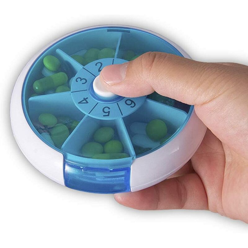 Dispenser - Il pianificatore di medicinali rotondo può essere ruotato senza problemi tramite il pulsante centrale. Sette scomparti separati possono dispensare i tuoi farmaci quotidiani 7 giorni su 7. 【Scatola per la conservazione dei farmaci facile da usare】 Il pannello superiore è trasparente, il che è molto utile per conoscere le informazioni dettagliate su capsule di farmaci e vitamine, olio di pesce. Apri lo sportello laterale, premi il pulsante bianco, la griglia interna ruota in senso orario e le cose escono dallo sportello laterale della scatola dei medicinali. 【Portapillole portatile da viaggio】Il diametro è di 3,5 pollici e il peso è solo 0,12 libbre. Puoi tenerlo in tasca o in borsa. È conveniente utilizzare questo distributore di farmaci ed è perfetto per i viaggi. 【Scatola per pillole dal design a prova di umidità】 La scatola per la conservazione dei farmaci mantiene le pillole lontane dall'umidità e protegge l'efficacia delle pillole. Adatto per conservare varie pillole
