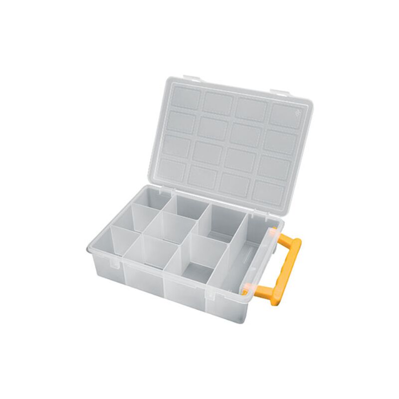 In polipropilene trasparente antiurto. Coperchio a chiusura ermetica. Separatori fissi che organizzano lo spazio interno in 10 scomparti. Con maniglia per il trasporto.