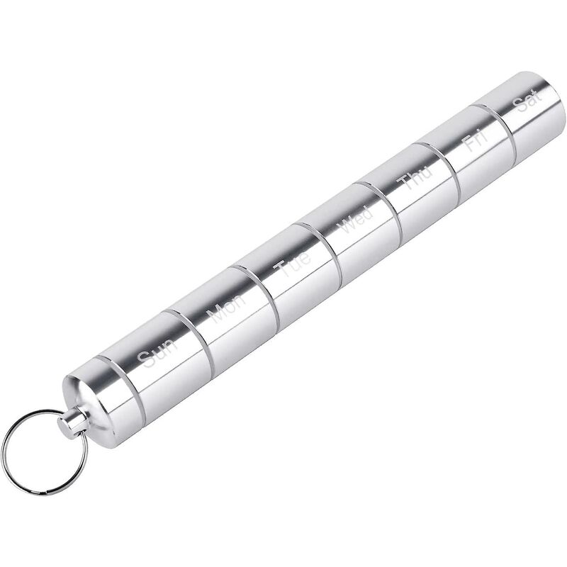 1. TAGLIA E PESO - Questa custodia organizer per pillole ha un'altezza di 18,5 cm, un diametro di 2 cm e un peso di 70 g. 2.PORTATILE E REGOLABILE - Questa scatola organizer per pillole è progettata con un portachiavi, è comoda da appendere al muro, alla borsa, al bagaglio o allo zaino. Questo portapillole per 7 giorni è ottimo per viaggiare, fare escursioni, pescare, andare in bicicletta, giocare a golf e qualsiasi altra attività all'aperto. 7 scomparti indipendenti, l'organizer giornaliero per portapillole può essere utilizzato come organizer da 1 a 7 giorni. 3.- Questa custodia organizer per medicinali è ermetica e stagna, la sua guarnizione O-ring garantisce l'impermeabilità al 100%. Non c'è bisogno di preoccuparsi di cadute accidentali. 4. QUALITÀ DI SICUREZZA - Questa custodia per dispenser di medicinali è realizzata in acciaio inossidabile, praticamente indistruttibile, protegge in modo sicuro i farmaci. 5. DESIGN PORTATILE E ALLA MODA - Questa scatola per pillole con