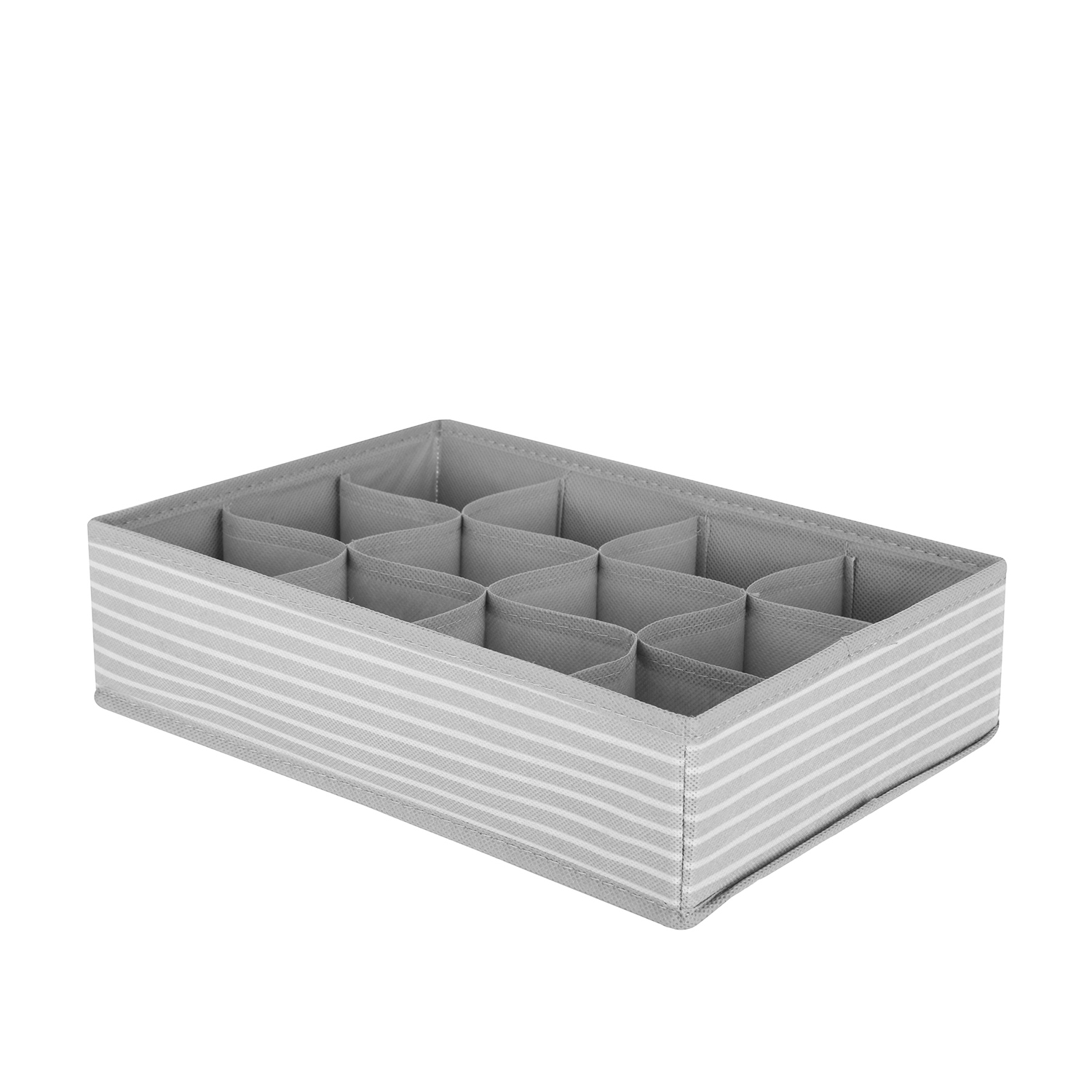 L'organizer pieghevole e salvaspazio della linea Sofia è una scatola funzionale per riporre in ordine oggetti e accessori personali all'interno di armadi, cassettiere e comodini. Dotato di divisori che lo suddividono in 12 piccoli scomparti uguali, è perfetto per organizzare foulard, cinture, gioielli e altri piccoli accessori ognuno con il proprio spazio. Grazie alla struttura pieghevole, occupa poco spazio quando non lo utilizzi e puoi portarlo anche in valigia per organizzare gli accessori in vacanza. Realizzato in resistente tessuto con rivestimento a righe bianche e grigio. Dimensioni: 32x22x9 cm.