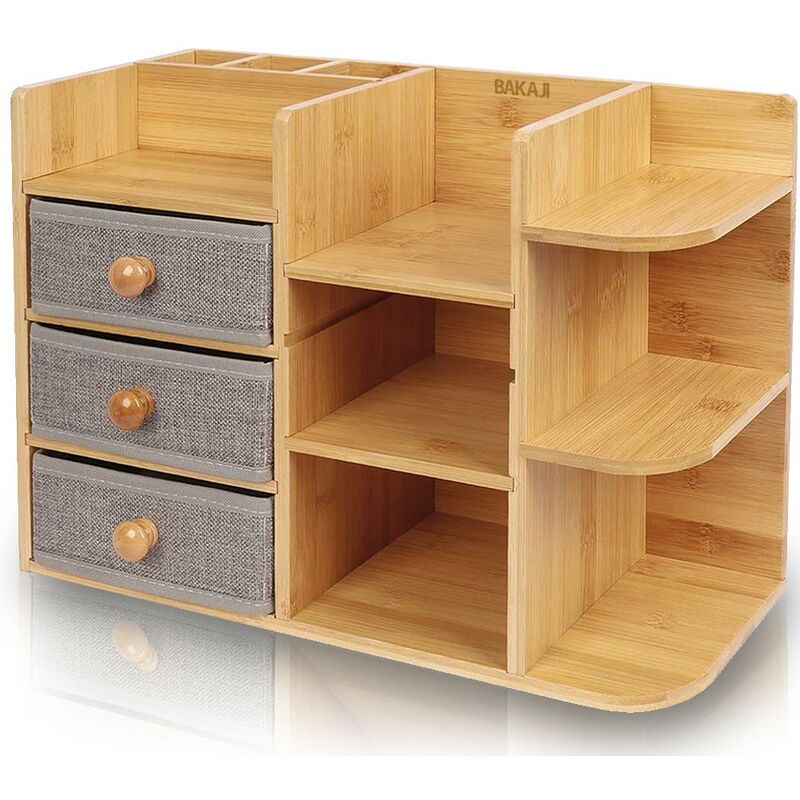 Mai più oggetti sparsi ed in disordine grazie all'organizer BAKAJI!Dotato di una grande capienza e variabilità, il mobiletto organizzatore consente di regolare l'altezza del vassoio per adattarsi a diversi tipi di cosmetici e contenitori.Grande capacità ed un forte senso estetico, il bambù naturale è più stabile dell'acrilico, protegge i tuoi cosmetici dalle cadute e dagli urti.Forte e duraturo, l'organizer è resistente all'acqua e agli urti, le sue linee lo rendono facile da pulire ottenendo il massimo risultato con il minimo sforzo.Potrai regolare l'altezza dello scomparto in base alle tue esigenze ed organizzare e sistemare come meglio credi i tuoi prodotti, per non perderli mai più! SPECIFICHE PRODOTTO:Marca: BAKAJIMateriale: bambùDimensioni: 41 x 17 x 30.5 cmColore: legno naturale e grigio3 Cassetti apribili1 scomparto regolabile in altezza7 RipianiDurevoleResistente agli urti e graffiResistente all'acqua 1 x Beauty Case Organizer Cosmetici Makeup Mobiletto in Bambù 41 x 17 x