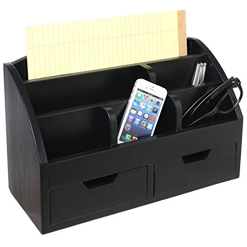 Organizer da scrivania a 6 scomparti, in legno, con 2 cassetti, colore: Nero.