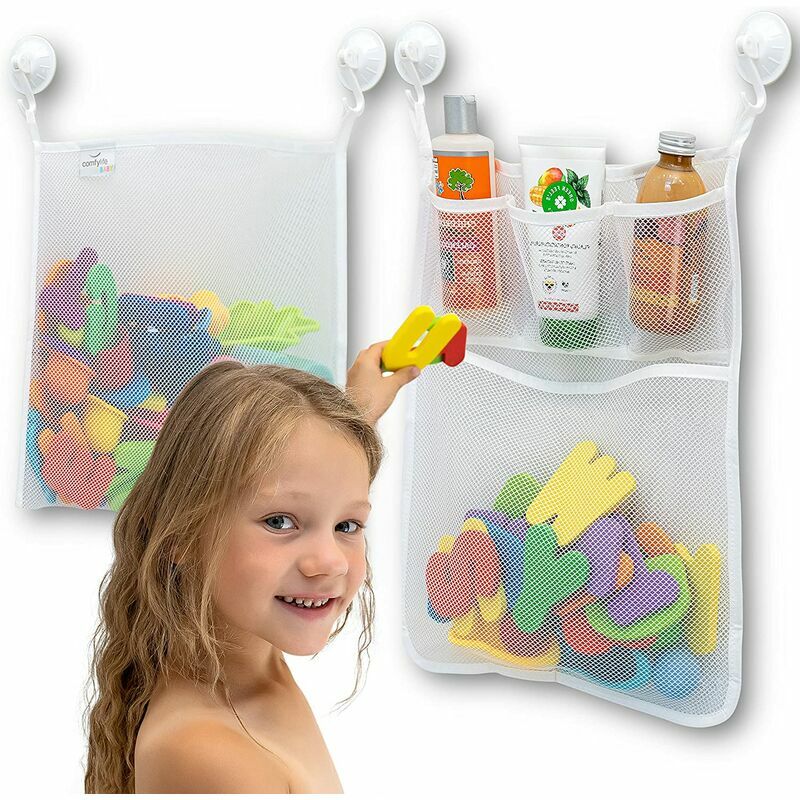 Ventose in cemento: a differenza di altre reti portaoggetti per il bagno, includiamo 6 ventose extra forti, non solo 4. Le nostre ventose si bloccano una volta che sposti il gancio verso il basso, il che significa che la tua rete portaoggetti per il bagno non si attaccherà ai bastoncini della parete e continua a cadere! Assicurati che la superficie sia piana e piatta per la migliore aspirazione. Organizer multiuso: questa è la soluzione per l'organizzazione e l'archiviazione del bagno che stavi aspettando! La grande tasca è perfetta per i giocattoli dei bambini (può contenere una tonnellata!), e il secondo organizzatore ha una piccola tasca e 3 tasche per sapone, shampoo, dentifricio e tutti gli altri elementi essenziali. La rete più resistente contiene più giocattoli ! Utilizziamo solo rete di altissima qualità, bordi in poliestere ad asciugatura rapida e ventose grandi e potenti. Le nostre borse a rete sono abbastanza grandi e robuste da contenere tutti i giocattoli del tuo bambino