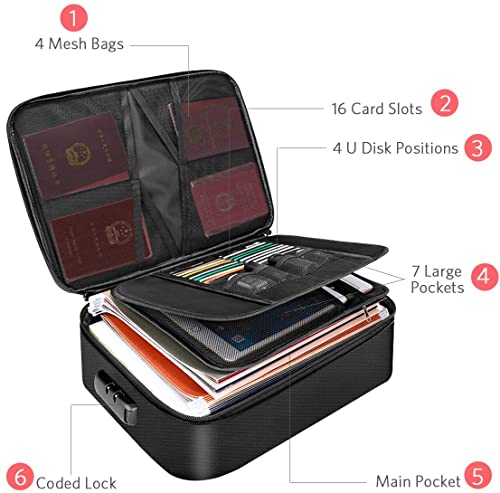 Grande capacità: 36 x 27 x 10 cm, la grande scatola portadocumenti ignifuga adotta un design a tre strati. Include 4 tasche in rete per passaporto, 16 slot per schede, 4 posizioni disco U, 7 strati di cartelle e una grande tasca principale. Può conservare documenti importanti, documenti, contanti, passaporti, dischi U, carte, laptop e certificati in modo sicuro e ordinato. È molto adatto per organizzare i tuoi file, permettendoti di trovare rapidamente tutti i file che stai cercando.