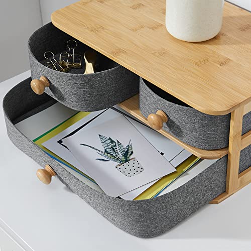 Organizzatore da Scrivania (AxLxP) 15 x 35 x 23 cm con 3 Cassetti in Tessuto Grigio - Mini Cassettiere da Tavolo - Struttura in Bambù