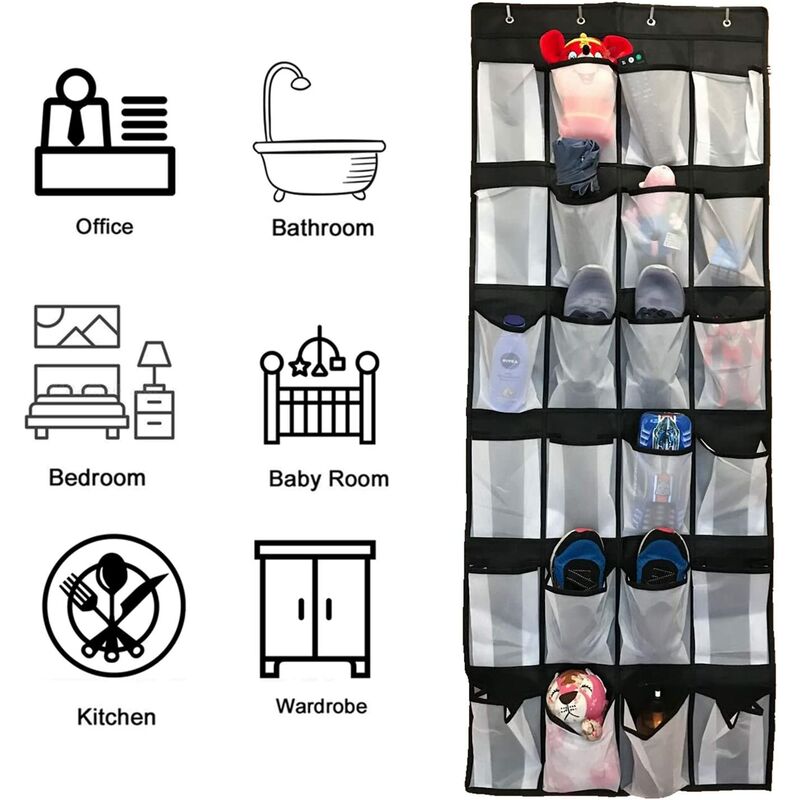 Totale 24 spaziose tasche a rete sospese, possono essere appese a una porta standard o a un'asta dell'armadio. Custodia inclusa in regalo 4 ganci per appendere: Il gancio è adatto per porte di spessore inferiore a 1,7 pollici, il design arrotondato assicura che i ganci in metallo non scavino nel legno delle porte Design tascabile in rete: Il tessuto grosso a maglia fine è robusto e durevole, rendendo facile vedere gli oggetti nelle tasche Perfetto salvaspazio: Ideale per scarpe, calze, giocattoli, accessori di bellezza e altro ancora. Può essere appeso in camera da letto, armadio, bagno, dormitorio, ecc., per garantire un ambiente domestico pulito e ordinato