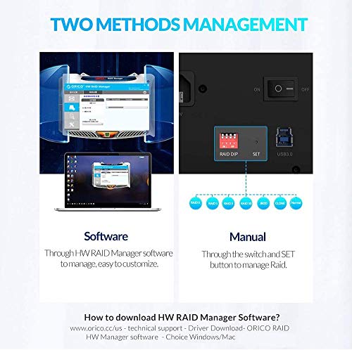 Supporta la funzione RAID configurabile RAID 0 (modalità stripe), RAID 1 (modalità mirror), JBOD (solo un gruppo di dischi) per ottenere una maggiore capacità dell'unità o una ridondanza sicura dei dati. Scarica l'hardware RAID più recente da https://www.orico.cc/us/download.html?skeyword=raid