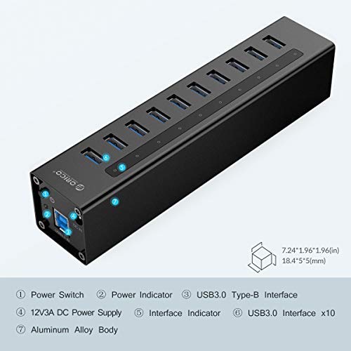 ORICO Alluminio Super Speed 10 Porte USB Hub USB BC1.2 Protocollo per Caricabatterie Hub Dati con Alimentatore 12V 3A e Cavo USB 1M - High End, High Speed - per PC Notebook Computer MacBook iMac