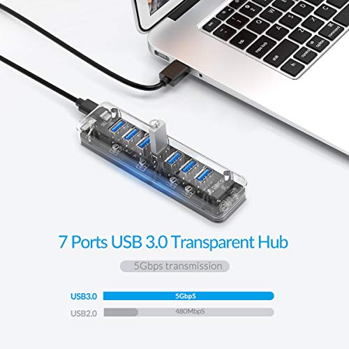 ORICO USB 3.0 Hub 7 Porte USB 3.0 Trasparente Desktop HUB con l'indicatore Blu Light & Doppia Porta di Alimentazione, 1M USB A Cavo Micro B, Mini Hub Portatile per MacBook, iPhone, Smartphone