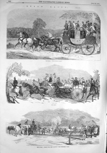 Original old antique victorian print CORSO 1857 DEL RECINTO CHIUSO DELLA DILIGENZA DELLE IPPICHE DI EPSOM