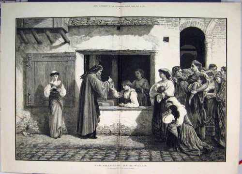 Original old antique victorian print La Gente 1877 del Medico che Allinea Su Per Essere Pozioni Curate