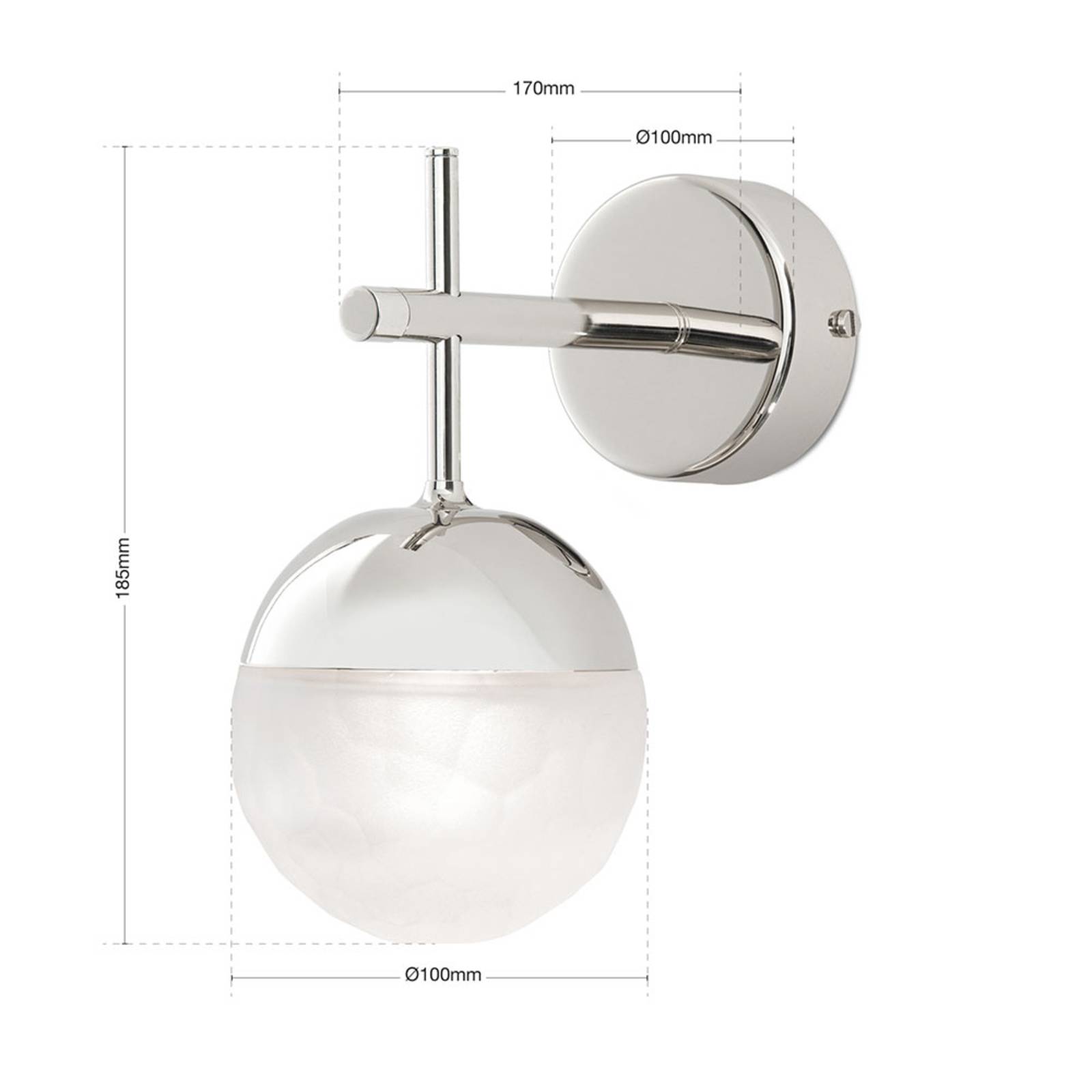 Lampada da parete a LED color nichel Ball con sorgente luminosa opaca e brillante verso il basso La lampada da parete Ball LED è costituita da un braccio orizzontale color nichel che sporge nella stanza ed è fissato ad un supporto circolare a parete dello stesso colore. Attraverso di essa un'altra asta corre verticalmente verso il basso e attraversa il braccio. Una sfera è fissata all'asta verticale all'estremità inferiore. Questo è fatto di vetro di cristallo tagliato a mano e ha un aspetto opaco convincente. A causa della natura irregolare della superficie, la luce viene leggermente rifratta e irradiata verso l'esterno dai LED interni. La distribuzione della luce è principalmente verso il basso e ai lati. Questo crea un bellissimo effetto di luce e una buona illuminazione generale. - dimmerabile con dimmer a fase di bordo d'uscita - Prodotto in Austria