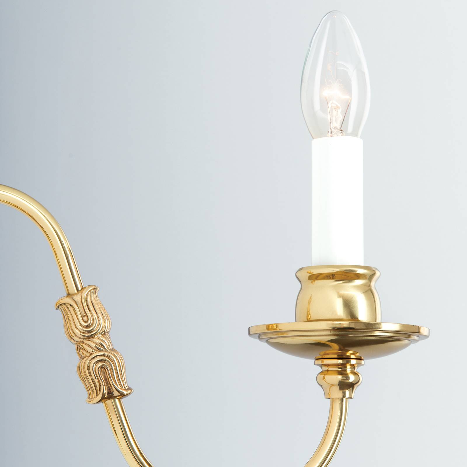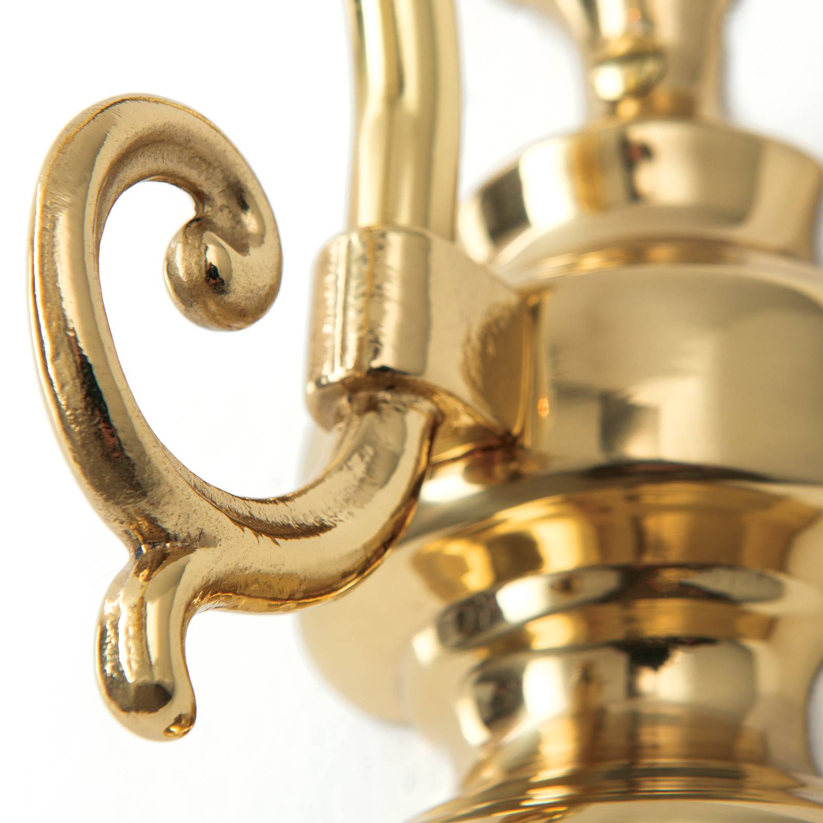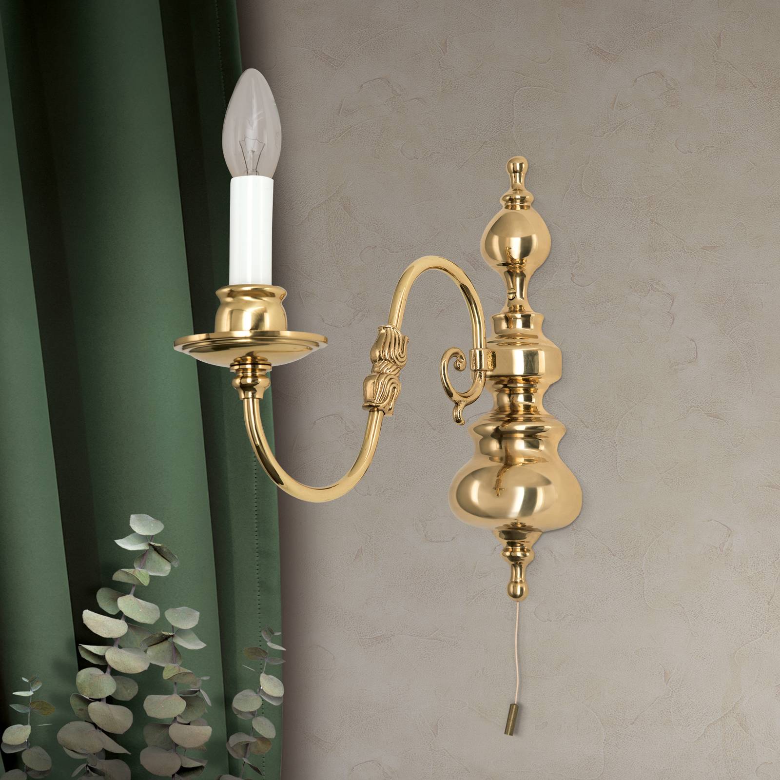 Elegante applique Imke come candelabro in stile fiammingo L'applique Imke è realizzata in autentico stile fiammingo e piace per il suo look suggestivo. La lampada a una luce a forma di candelabro è realizzata in ottone con superficie lucida. Il suo supporto a parete è raffinatamente modellato. Sul delicato braccio è posizionato il portalampada a candela bianco. Imke conferisce all'ambiente abitativo un tocco di antichità. Per questo motivo la splendida applique è adatta all'elegante illuminazione puntuale oppure può illuminare in modo raffinato i passaggi come p. es. i corridoi. Grazie all'interruttore a strappo può essere accesa nel punto in cui si trova. Questo è particolarmente pratico se è posizionata vicino a una poltrona o un divano. L'applique può essere quindi comodamente accesa da seduti. Prodotto di qualità austriaco.