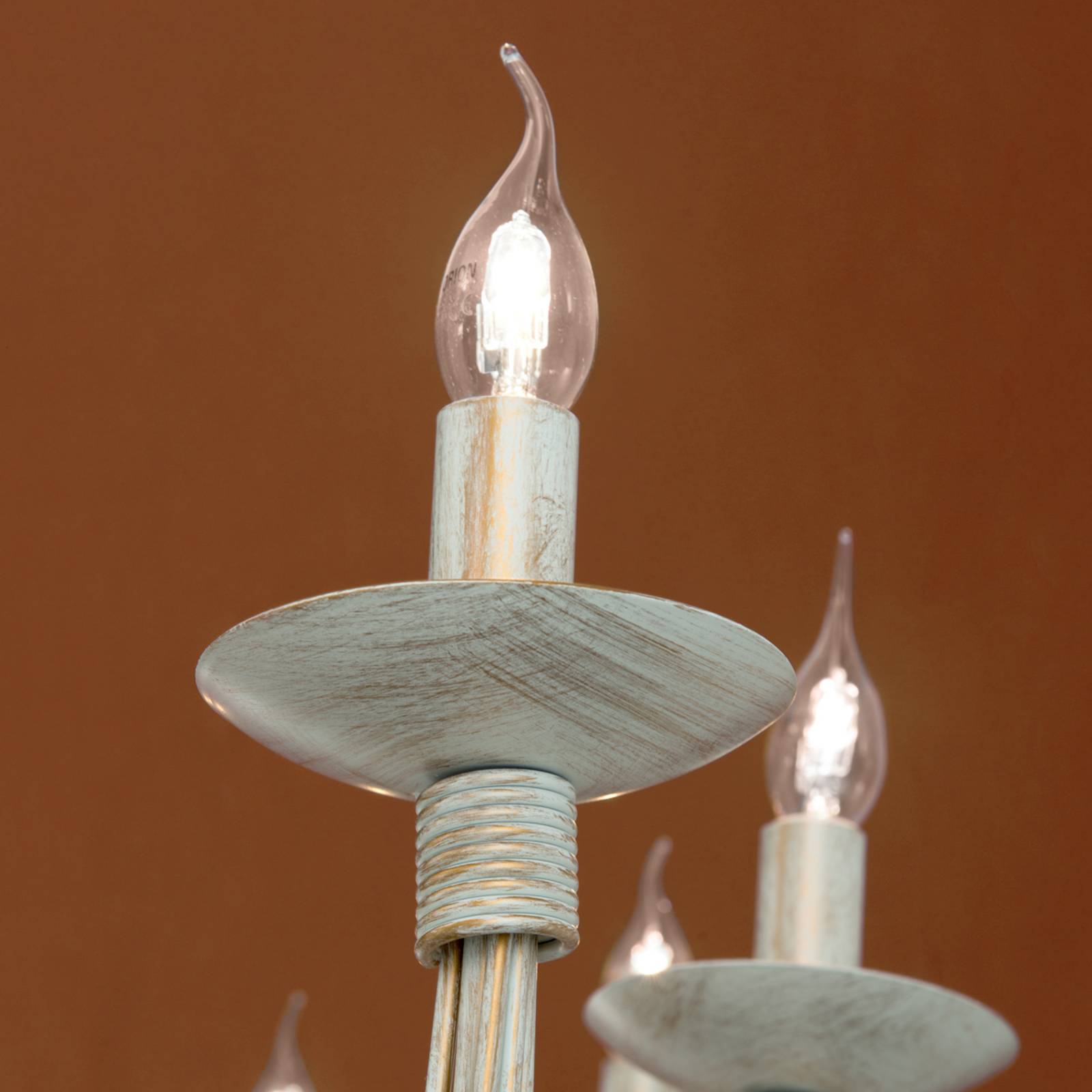 Lampadario classico Antonina nel design stile rustico a 16 luci Questo appariscente lampadario di metallo nel design rustico garantisce un'illuminazione ambiente festosa in una casa arredata in stile rustico. La delicata tonalità avorio del metallo armonizza con molti colori. 16 lampadine a candela fanno splendere Antonina in una luce chiara. Vengono impiegati sedici lampadine E14 da 40 Watt. Le lampadine a candela che risaltano maggiormente sono quelle colpo di vento Le lampadine non sono compresi nel volume di fornitura ma ordinabili come accessori.