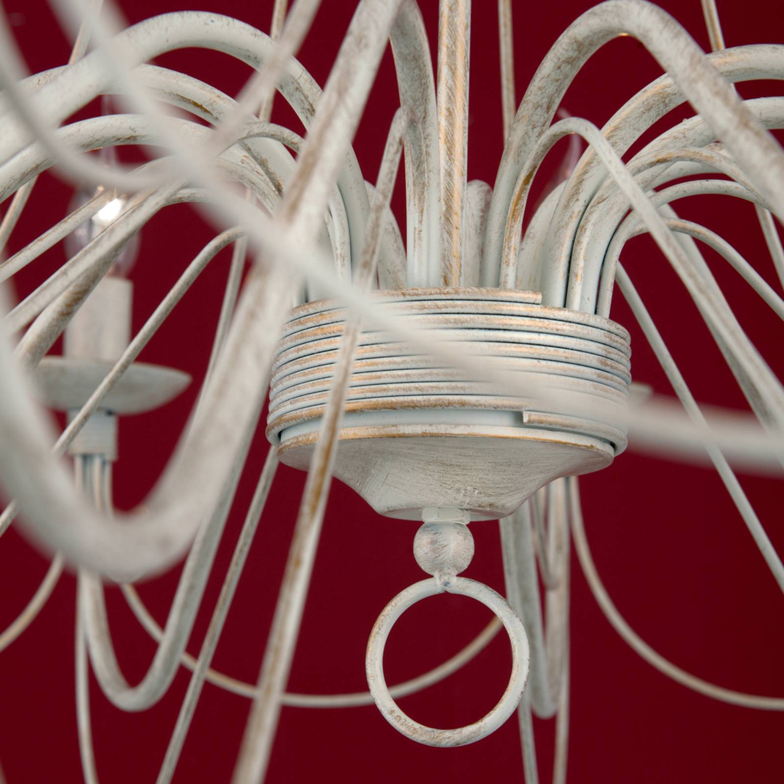 Lampadario Antonina nel design rustico a 12 luci Il lampadario Antonina a 12 luci, che pende dal soffitto con una catena rustica, diffonde una luce suggestiva. E' verniciato con un colore chiaro avorio e nonostante il suo design filiforme ha un aspetto prestante. Il design rustico si integra perfettamente in un arredamento stile country. Antonia diffonde un'illuminazione particolarmente piacevole se si usano come lampadine lampadine a candela colpo di vento. lampadine non compresi, ma disponibili come accessori).