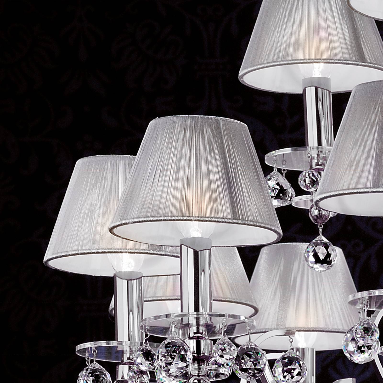 Lampadario Design di cristallo cromato con sospensione a catena a 18 luci Quale dei dettagli decorativi del lampadario di cristallo a 18 luci si dovrebbe nominare per primo? Nessuno o tutti, perché combinati formano una sorgente luminosa che già da spenta rappresenta un elemento di grande attrazione, ma che con l'illuminazione diffonde una brillantezza senza precedenti. I paralumi di stoffa sembrano essere composti da singoli fili argentati e donano alla luce emanata un fascino particolare. La luce fa scintillare in modo esaltante anche i cristalli Swarowski. La cromatura lucida dei bracci quadrati nella sezione trasversale completa l'insieme fantastico che decora qualsiasi salone. Perfettamente adatta anche per l'illuminazione festosa nei saloni degli alberghi. lampadine non compresi. Le lampadine a candela da 40 Watt possono essere ordinate come accessori.