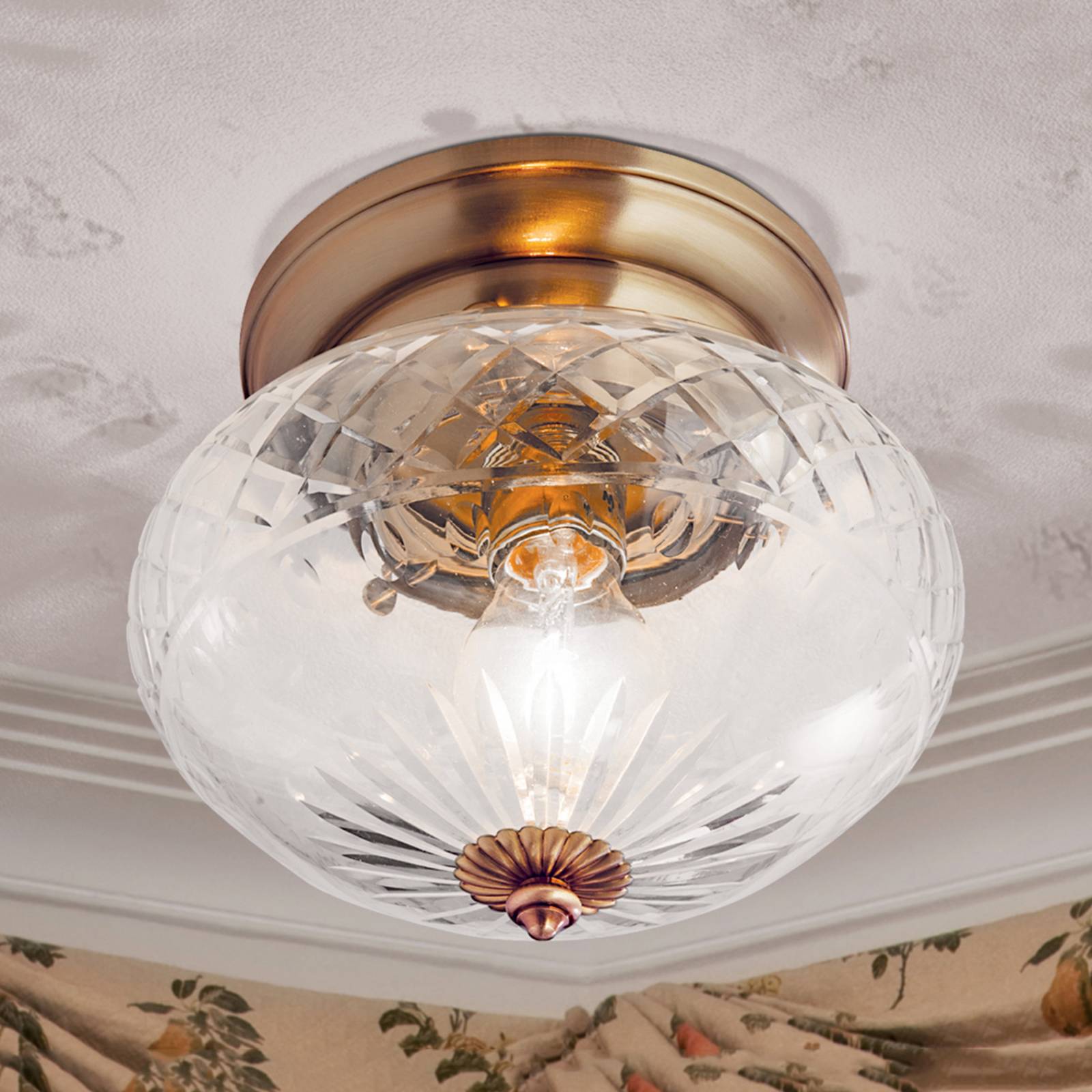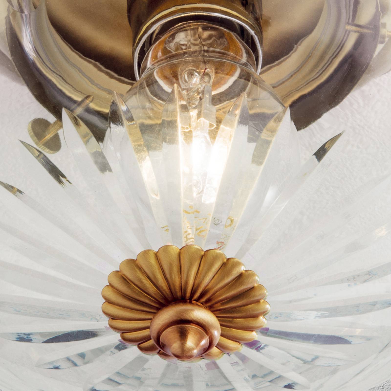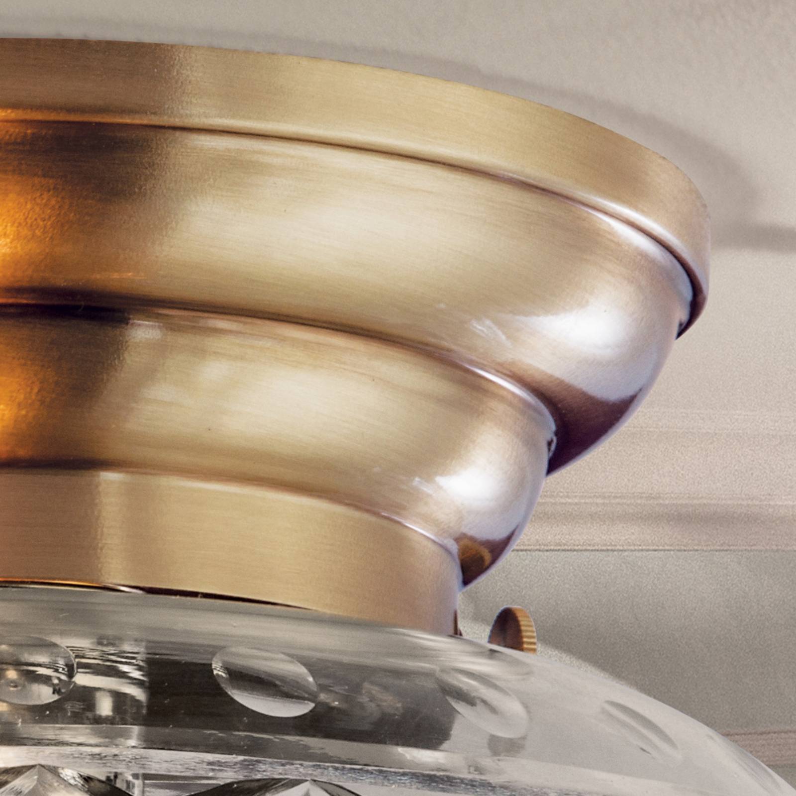 Plafoniera in foglia di bronzo ENNA con vetro trasparente molato a mano Vetro trasparente finemente lavorato con mola diamantata e la superficie in foglia di bronzo dominano l'aspetto di questa pregiata plafoniera che si adatta perfettamente alle abitazioni e case arredate in stile classico. Il baldacchino color bronzo dona a ENNA un aspetto caldo e non per ultimo esclusivo. In queste lampade qualità, eleganza, pregiata lavorazione e durata sono al centro dell'attenzione. Qui la creatività dei designer e l'arte artigianale austriaca si fondono in un prodotto molto apprezzato in tutto il mondo. Dal 1948 le lampade di questo produttore vengono prodotte al 100% in Austria, il che garantisce anche una disponibilità di ricambi pluriennale. Su richiesta disponibile anche in altre dimensioni e superfici.