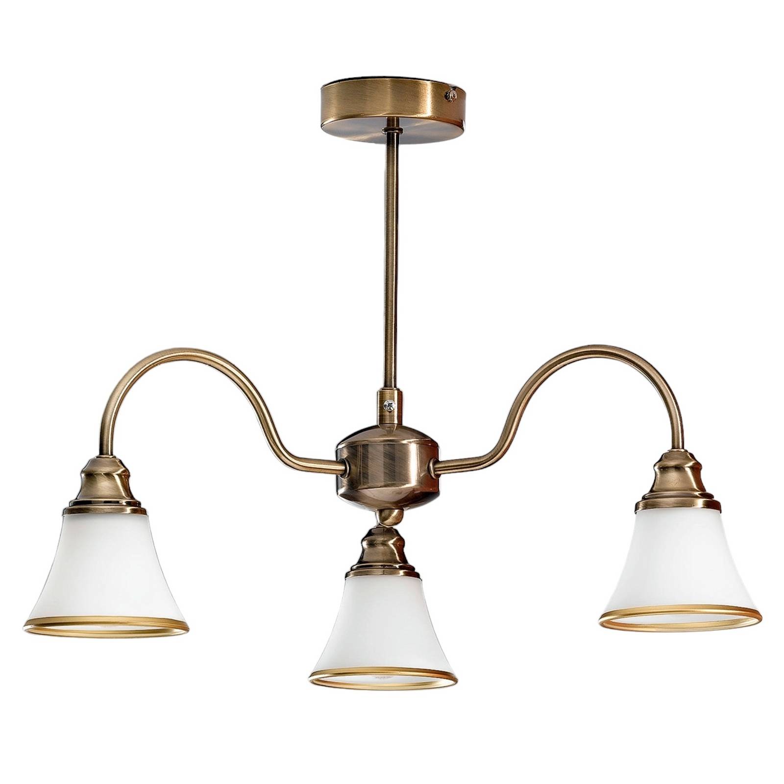 Plafoniera TILDA a tre luci con lampadine da 40 Watt La plafoniera TILDA è dotata di tre lampade della stessa dimensione che hanno un paralume di vetro con superficie opacizzata. Nasce così un raffinato contrasto tra una patina di ottone antico sulle barre e una decorazione dorata sui bordi dei paralumi di vetro. Ideale come integrazione in un salotto o una sala da pranzo di piccole dimensioni.