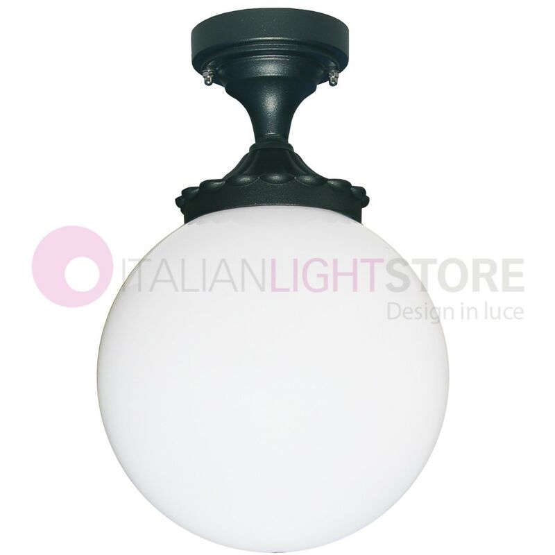 diffusore sfera d.25 cm. in policarbonato OPALE. Lanterna a soffitto, plafoniera per esterni in pressofusione di Alluminio verniciata con polvere poliestere (la verniciatura a polvere viene fatta dopo un trattamento anticorrosivo per elevare la resistenza ai raggi UV e alle nebbie saline), ideale per illuminare facciate di case, spazi aperti, porticati e verande. Dimensioni: h. 38,5 cm., base a soffitto d.11,5 cm. Caratteristiche tecniche: ° pressofusione di alluminio EN AB 46100 made in Italy, realizzato con materiali di alta qualità;