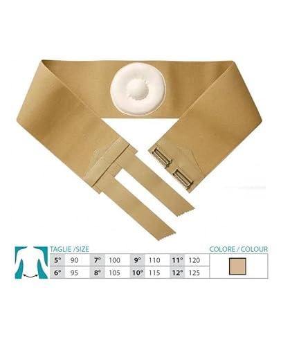 Cinto per ernia ombelicale con pelotta rivestita in pelle. Per calcolare correttamente la tua taglia devi misurarti il girovita un paio di centimetri sotto l'ombelico come si indica nella seconda immagine del prodotto.