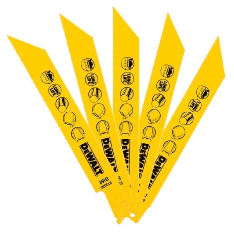 Lame per sega orizzontale bi-metal - DT2385-QZ Costruzione bimetallica, come combinazione di corpi HCS e taglio HSS in lega di cobalto Geometria del dente aggressiva con un nuovo angolo speciale per una rimozione rapida ed efficace del materiale, in particolare per i metalli in trazione e abrasivi Ideale per applicazioni estreme e per i lavori di demolizione Applicazioni Per tagliare lamiere,tubi e profili metallici. Per taglio veloce su metalli ferrosi e non ferrosi Specifiche Lunghezza del prodotto 4.9 in Larghezza del prodotto 20.2 in Numero di pezzi 5 Lunghezza del prodotto 152 mm