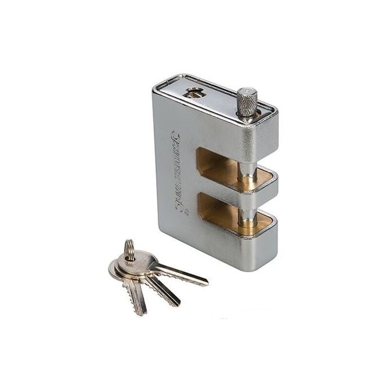 Lucchetto blindato con doppio punto di chiusura per una maggiore sicurezza nel caso di utilizzo con catena rivestita con guaina (non inclusa). Include 3 chiavi in acciaio. Dimensioni (l x H x L): 90 x 75 x 30 mm. Diametro gambo 11 mm. Peso 1 kg.