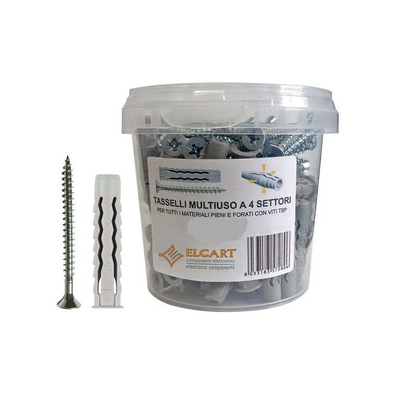 Pratico secchiello di 100 tasselli multiuso a 4 settori con viti a croce TSP zincate. Misura: 6x30 mm Corpo in nylon a 4 settori;